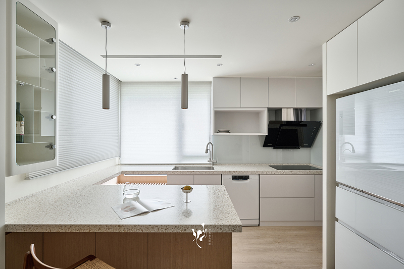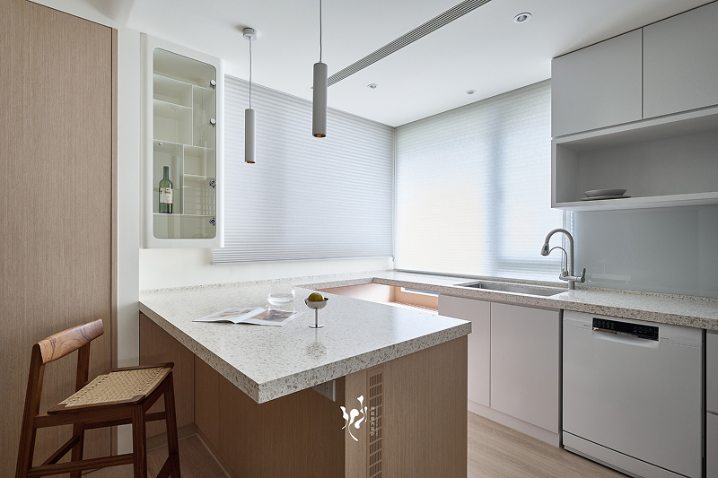 我們拆除了侷限景觀的原始牆面,將廚房的中島面積加大,讓陽光及視野照入屋內,給時常work from home的屋主有如渡假的工作空間,與未來孩子相伴寫功課、親友們聚會、一家人圍繞著產製甜點的所在,被滿滿的甜香包圍,成為家庭核心的主要空間。