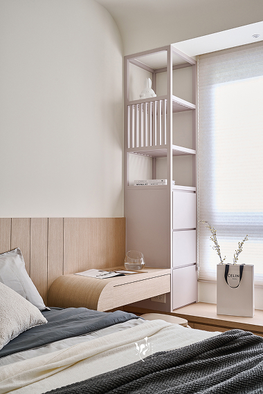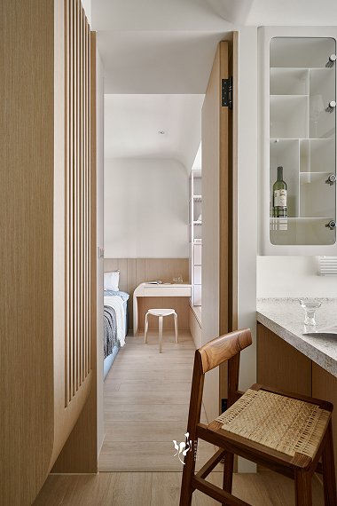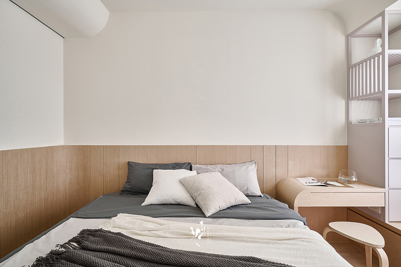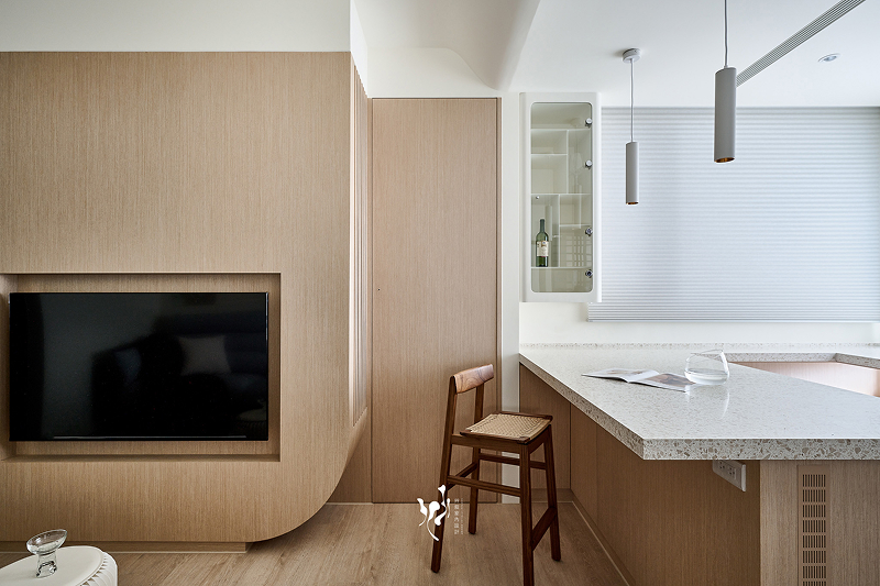 這個案件的收藏品很活潑,奶白色櫃體襯托出各收藏品的特色,並分區規劃收藏品的品項,使其在各區呈現出不同的收納主題特色,另也採用弧形放大空間尺度,為14坪小宅豐盈生活層次,而留白的設計,是為了讓屋主填上屬於他們的顏色,成就設計師與屋主共同完成這個家的理想。