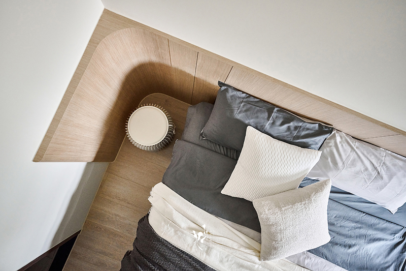 男主人及女主人的主臥室 天花造型、床背板及床頭櫃各 1/4 圓相互組合成完整的 O 形,象徵圓滿與和諧