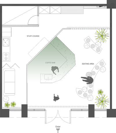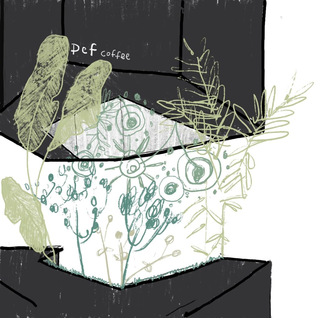 期望打造一處 SLOW BAR,像城市中的綠洲,在喧囂裡提供片刻寧靜,讓人能在舒適而從容的氛圍中,細細品嘗一杯屬於日常的咖啡;同時為咖啡師塑造一個被看見的視覺焦點,讓來往的上班族與學生在匆忙步調中,也能停下腳步,感受時間慢下來的溫度。於是,「綠洲舞台」的概念,就在這片靜謐裡悄然誕生。