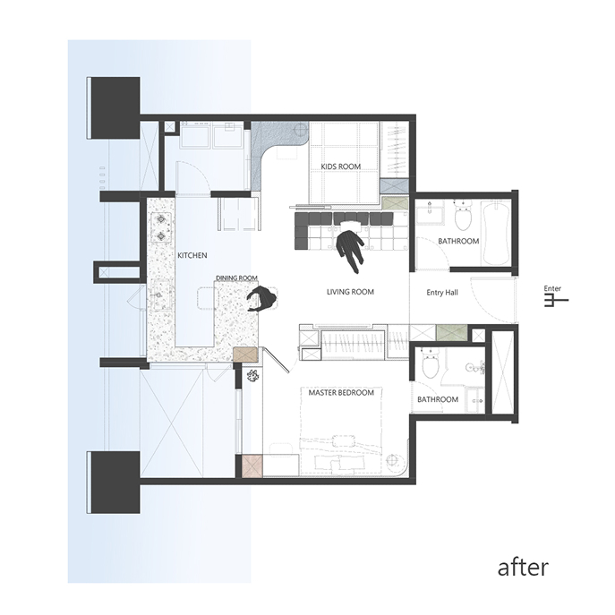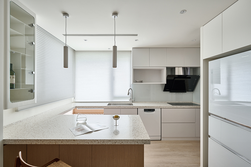 我們拆除了侷限景觀的原始牆面,將廚房的中島面積加大,讓陽光及視野照入屋內,給時常work from home的屋主有如渡假的工作空間,與未來孩子相伴寫功課、親友們聚會、一家人圍繞著產製甜點的所在,被滿滿的甜香包圍,成為家庭核心的主要空間。